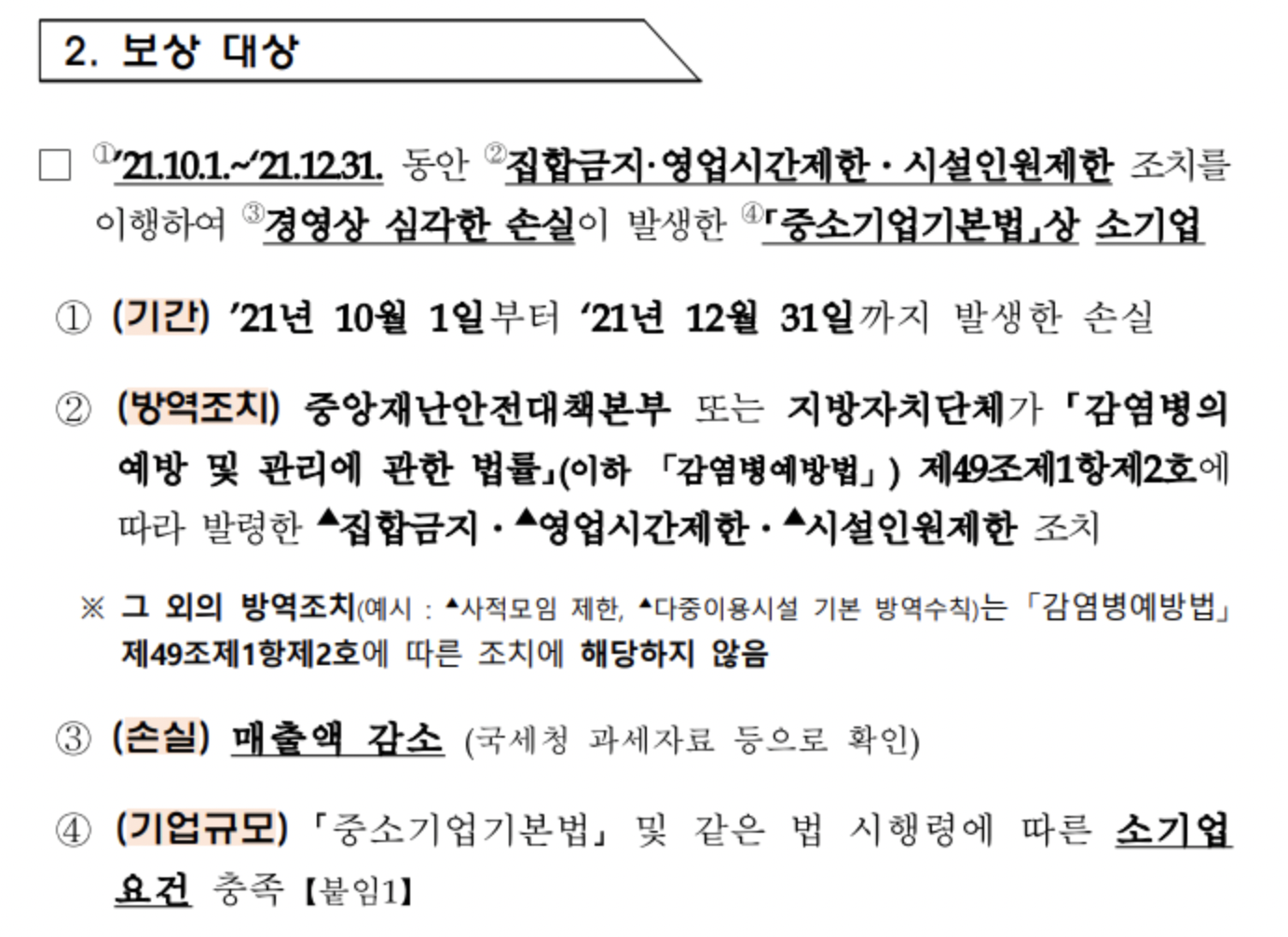 - 거리두기 방역조치를 받았던 소상공인 / 소기업 + 중기업(매출액 10억 ~ 30억) 370만개 업체이며 매출액 10억~30억 원 규모의 중기업도 지원 대상입니다.