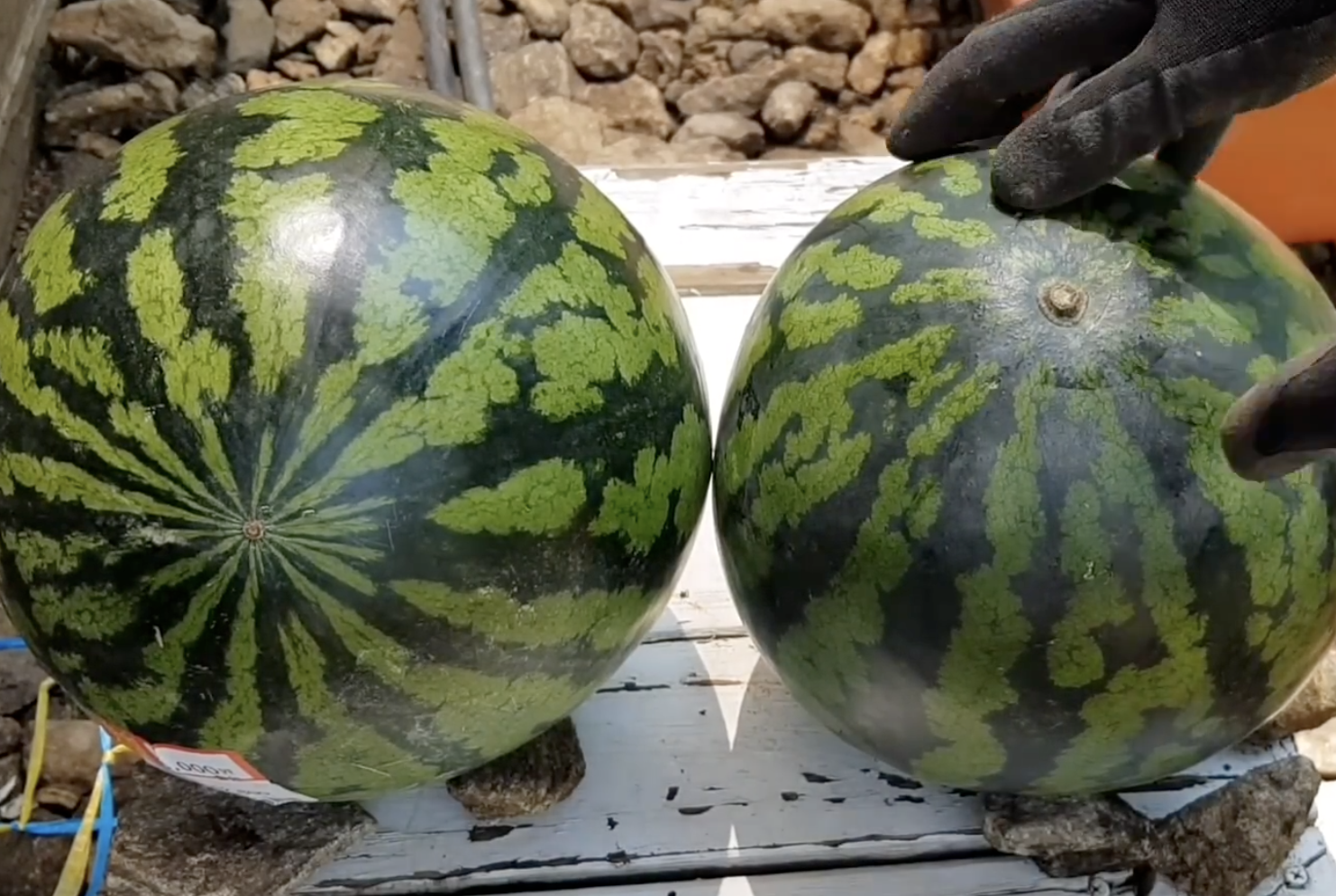 배꼽 주변이 올라온 것은 숫 수박이며 배꼽 주변이 낮은 것은 암 수박입니다.