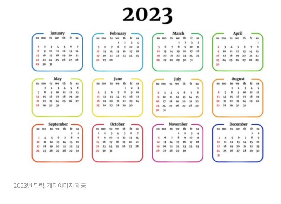 12일 과학기술정보통신부가 발표한 "2023년 월력요항"에 따르면 내년도 달력에 빨간색 표기되는 내년 쉬는날은 주 5일 근로자는 쉬는 날이 올해보다 이틀 적은 것으로 확인되었습니다.
