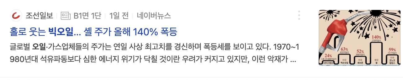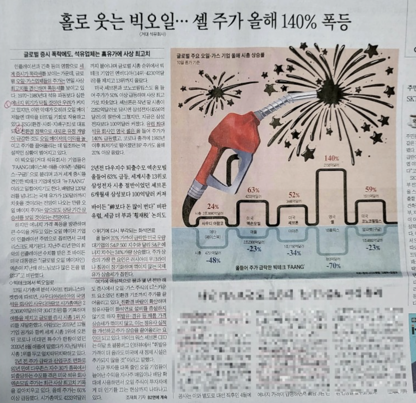 미국 셰브론과 코노코필립스도 올해 들어 50% 이상 급등하며 사상 최고치를 경신했습니다. 셰브론은 지난해 말 시가총액이 2262억 달러로 당시 삼성전자(4556억 달러)의 절반에 불과했지만 지금은 삼성전자보다 100억 달러 더 큽니다. 유럽 최대 석유회사인 셸은 올해 주가가 140% 급등했고, 1993년 이후 최저가로 떨어졌던 BP의 주가도 올해 20% 이상 올랐습니다.