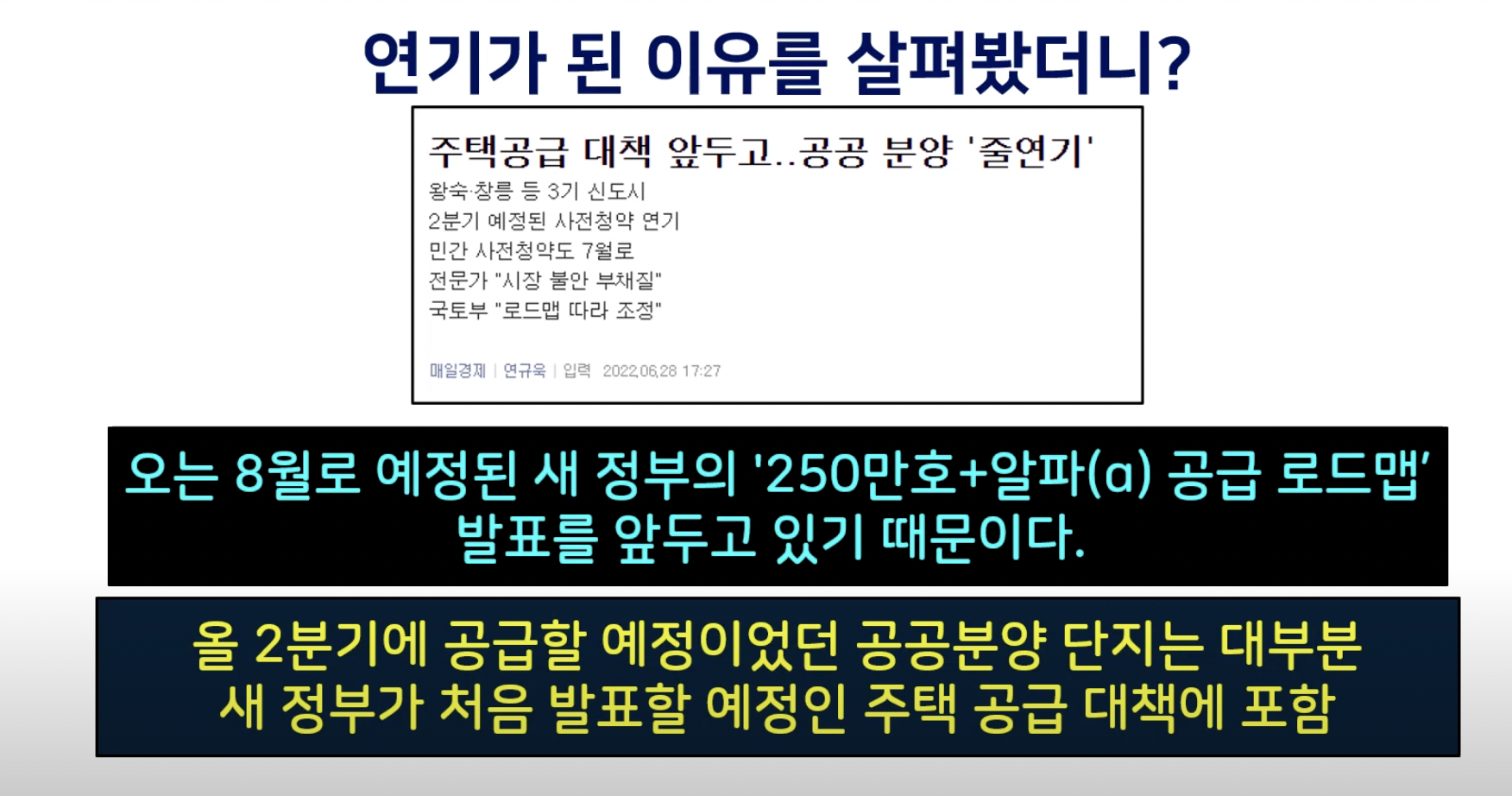 모두 서울과 인접한 입지의 신도시 물량으로 청약 대기자들은 높은 관심을 가지고 기다리고 있었습니다. 시장에서는 사전청약 일정이 줄줄이 연기되는 것을 인위적인 조정으로 실수요자들에게 불편을 주고 시장에 불안심리를 더 부채질할 수 있다는 지적이 나오고 있습니다. 이에 대하여 고종완 한국 자산관리 연구장은 ‘새 정부 철학에 맞게 기존 공급 계획을 수정 보완하는 것은 자연스러운 일”이라고 평가를 하면서도 ‘가뜩이나 원자재 가격 상승으로 신축 분양 물량이 줄어들고 있는 상황에서 이 같은 공급 연기는 청약 대기자들의 불안 심리를 부채질하는 격”이라고 지적을 하였습니다.