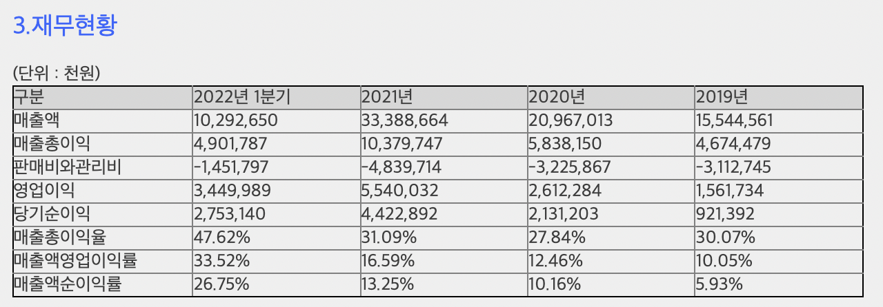 매출액 영업이익 모두 계속 성장 향후 미래 산업으로 기대기 되고 있습니다.
