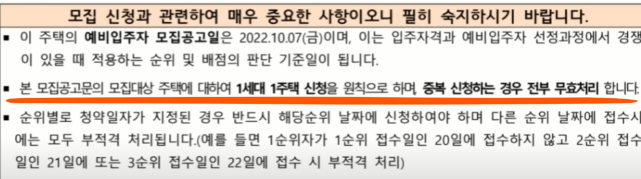모집 공고문의 모집 대상 주택에 대하여 1세대 1 주택 신청을 원칙으로 하며 중복 신청하는 경우 전부 무효 처리합니다 그리고 순위별로 청약 일자가 지정된 경우 반드시 해당 순위 날짜에 신청해야 되며 다른 순위 날짜에 접수 시에는 모두 부적격 처리됩니다.