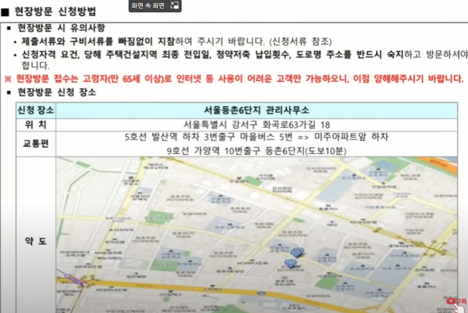 신청 장소는 서울 등촌 6단지 관리사무소로 주소와 교통편 약도는 여기에 나와 있으니 보시기 바랍니다.