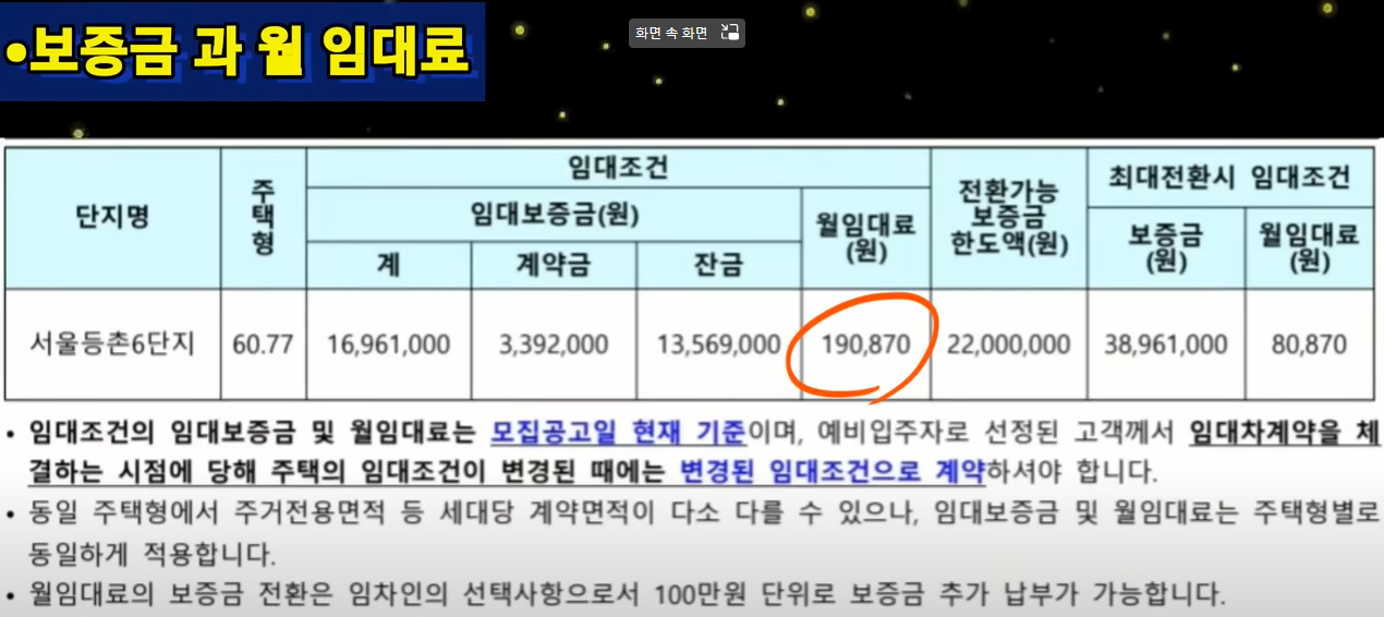 그 보증금과 월 임대료는 얼마인지 한번 보겠습니다. 이번에 모집하는 서울 등촌 6단지는 주택형 60평으로 전용면적은 42.9 제곱미터입니다 전체 평수로는 17평 실평수는 13평입니다.