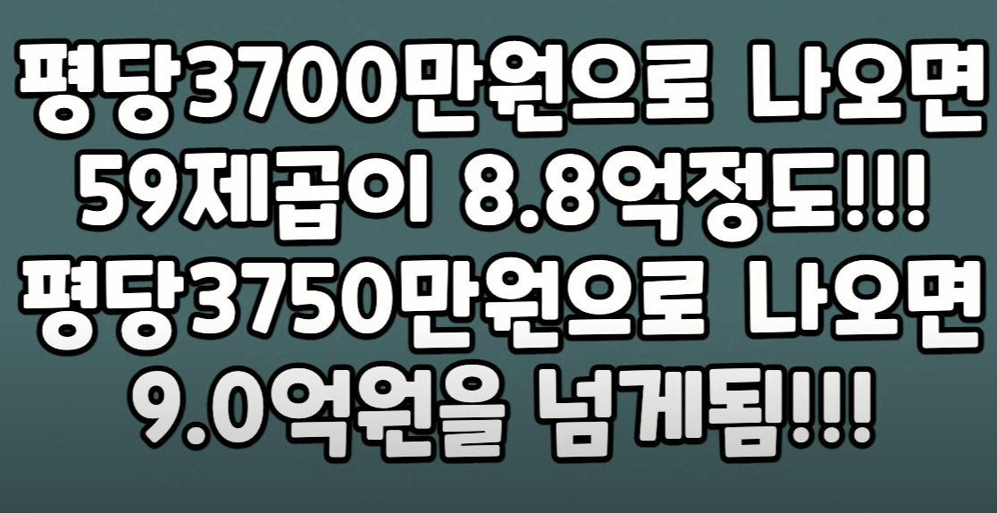 중도금 대출 한도가 9억에서 12억 선으로 확대가 됐죠 이젠 9억이 넘어가도 12억 선까지 중도금 대출이 가능해졌고요 이런 규제 만화가 평당 3,750만 원으로 올라서는 발판이 돼서는 안 될 것 같고요 지금 분양시장 분위기로 봐서 그냥 깔끔하게 평당 3,700만 원으로 나와서 59 제곱이 9억 선을 넘지 않는 방향으로 확정이 될 것 같습니다.