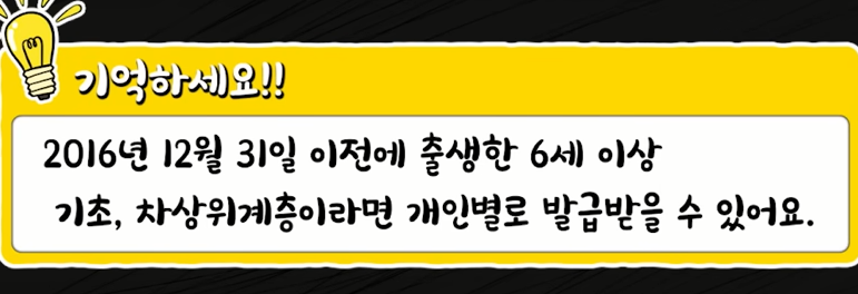 가구당 한 장씩인 줄 잘못 알고 계신 분들이 많아서 보통 문화활동을 많이 하는 자녀분들이나 어머니 이름으로 하나만 발급받고 세대원 전원이 발급받지 않는 경우가 많습니다 2016년 12월 31일 이전에 출생한 6세 이상 기초 차상위계층이라면 개인별로 발급받을 수 있고요 사용기간은 카드 수령 2시간 후부터 올해 12월 31일까지입니다.