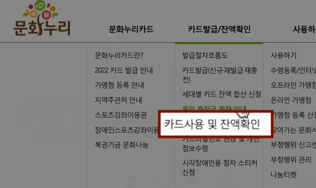 만약에 자동 재충전이 되지 않아서 새로 충전하신다거나 신규로 신청하시는 분들 신청 방법은 가까운 주민센터에 방문하셔서 구비되어 있는 신청서 제출하시면 되고요 문화누리카드 홈페이지에서 카드 발급 잔액 확인 메뉴에 카드 발급 페이지에서 하시거나 앱에서 같은 방법으로 신청과 재발급 재충전하실 수 있습니다.