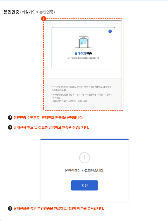 3. 휴대전화 본인인증 절차를 진행 후 확인 버튼 클릭
