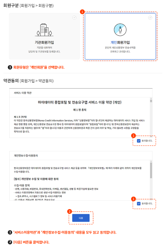 2. 서비스 이용약관 개인정보수집 이용동의서 모두 동의 다음 버튼 클릭