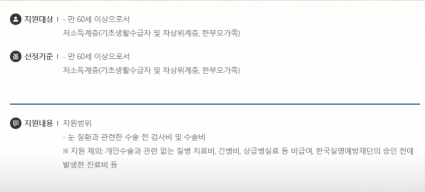 만 60세 이상으로 기초생활수급자 및 차상위계층 한부모가족 등 저소득층을 대상으로 하는데요 눈 질환과 관련한 수술 전 검사비와 수술비를 지원합니다. 문의는 보건복지상담센터 129번이나 관할 보건소에 문의하시면 됩니다.