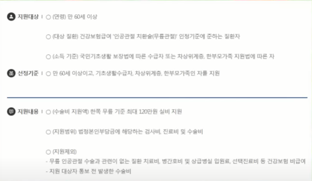 만 60세 이상 어르신으로 기초생활수급자 차상위계층 한부모가족을 대상으로 하는데요 수술비는 한쪽 무릎 기준으로 최대 120만 원 실비로 지원하며 검사비 진료비 수술비 등을 법정 본인부담금에 해당하는 만큼 지원하게 됩니다.
