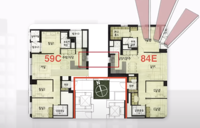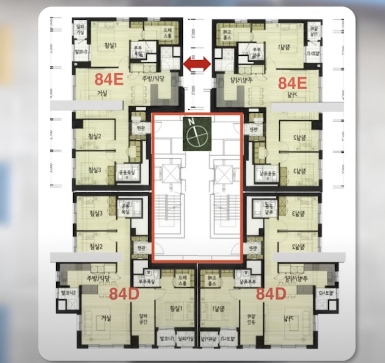 논란이 되고 있는 곳은 바로 84e 타입입니다. 같은 층의 주택이 주방 창들이 마주 보는 형태로 배치돼 있습니다. 주택 간 간격이 2m가 채 안될 정도로 맞붙어 있어서 이웃집 내부가 들여다 보이는 구조입니다. 이거 도대체 누가 이따위로 설계를 했는지 건축을 전공한 사람이 맞는지 의심이 될 지경입니다.