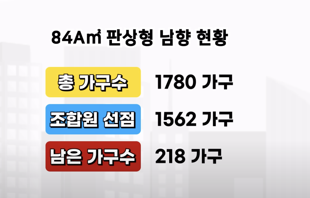 실제로 선호도가 가장 높다고 이야기하는 84 판상형 a 남향의 경우에는 조합원이 1780가구 중 1562 가구를 선점하여 남은 가구수는 218 가구밖에 되지 않는다고 합니다. 주변 부동산에서는 현재 근방의 시세가 평당 5000으로 평당 3천만 원대 분양을 받는 다면 해당 물량은 전량 소진될 것으로 보고 있다고 합니다.