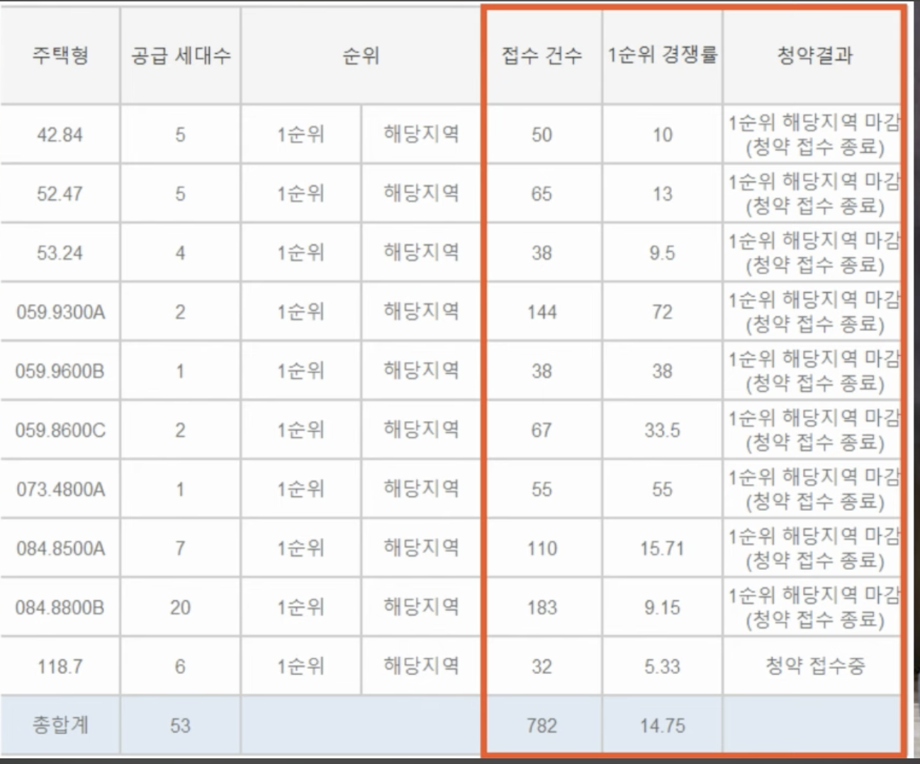 분양가가 높아서 경쟁률이 그리 높지 않을 거라는 예상이 많았었는데요 웬걸 이런 전망을 완전히 비웃는 결과가 나 왔죠 역시 입지가 좋은 곳은 분양가 압박에 대해서 그리 큰 동요를 하지 않는 것으로 보입니다. 전체 1순위 경쟁률 평균이 14.75대 1이 나왔습니다. 상당히 예상했던 것보다 높은 경쟁률이라는 걸 알 수 있어요