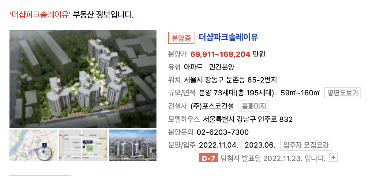 어제 특별공급 결과를 어느 정도 분위기를 예상할 수 있었는데요 바로 둔촌주공의 미니멈이라고 할 수 있는 더샵 파크 솔레이유 여기는 규모가 작은 단지라서 그렇지 입지도 둔촌주공과 붙어 있고요 분양가도 분위기가 아주 유사한 곳이죠 59 제곱 8억 9천 선 84 제곱 13억 선이었습니다.