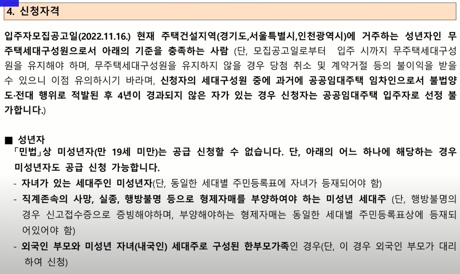 신청자격을 설명드리겠습니다. 2022년 11월 16일 기준만 19세 이상인 무주택 세대 구성원으로 주택 건설지역에 거주하며 다음 기준을 충족해야 합니다.