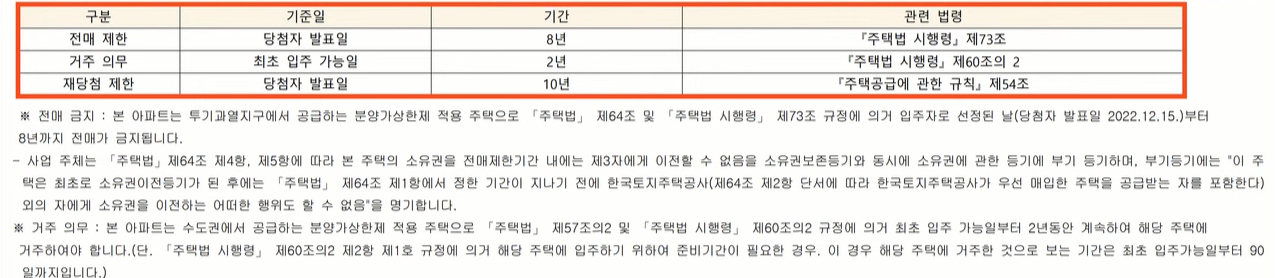 규제사항이 좀 빡빡한 편이죠 전매제한 8년 재당첨 제한 10년 실거주 의무는 2년이 되겠습니다 청약 일정은 특별공급 12월 5일 1순위 12월 6일 당첨자 발표는 12월 15일이 되겠습니다 아무튼 어떤 청약 결과가 나오게 될지 가장 궁금해할 수 있는 가장 뜨거운 이슈가 될 단지임은 분명해 보입니다.
