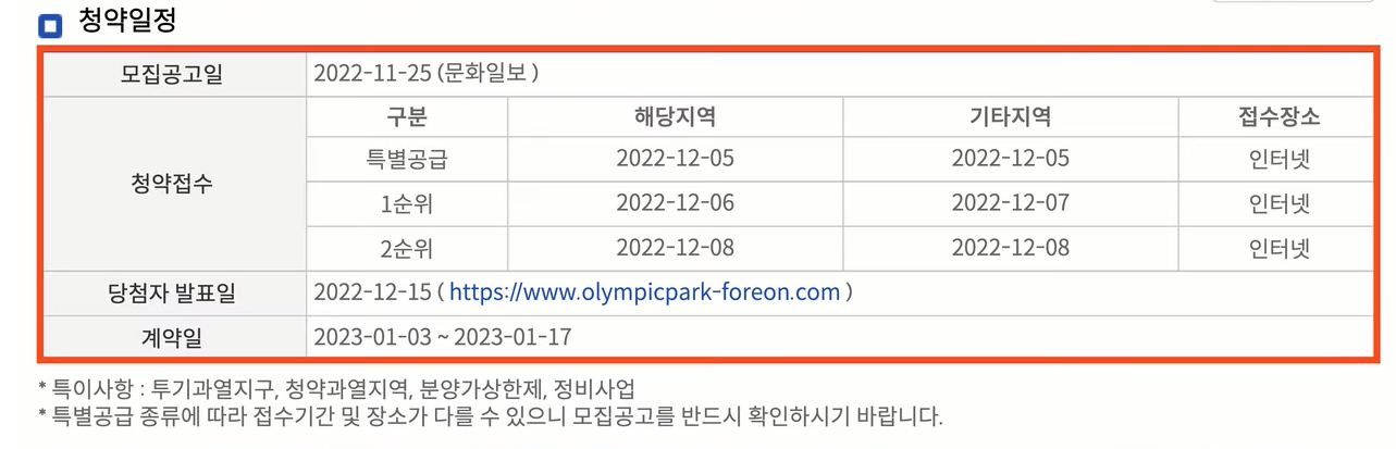 규제사항이 좀 빡빡한 편이죠 전매제한 8년 재당첨 제한 10년 실거주 의무는 2년이 되겠습니다 청약 일정은 특별공급 12월 5일 1순위 12월 6일 당첨자 발표는 12월 15일이 되겠습니다 아무튼 어떤 청약 결과가 나오게 될지 가장 궁금해할 수 있는 가장 뜨거운 이슈가 될 단지임은 분명해 보입니다.