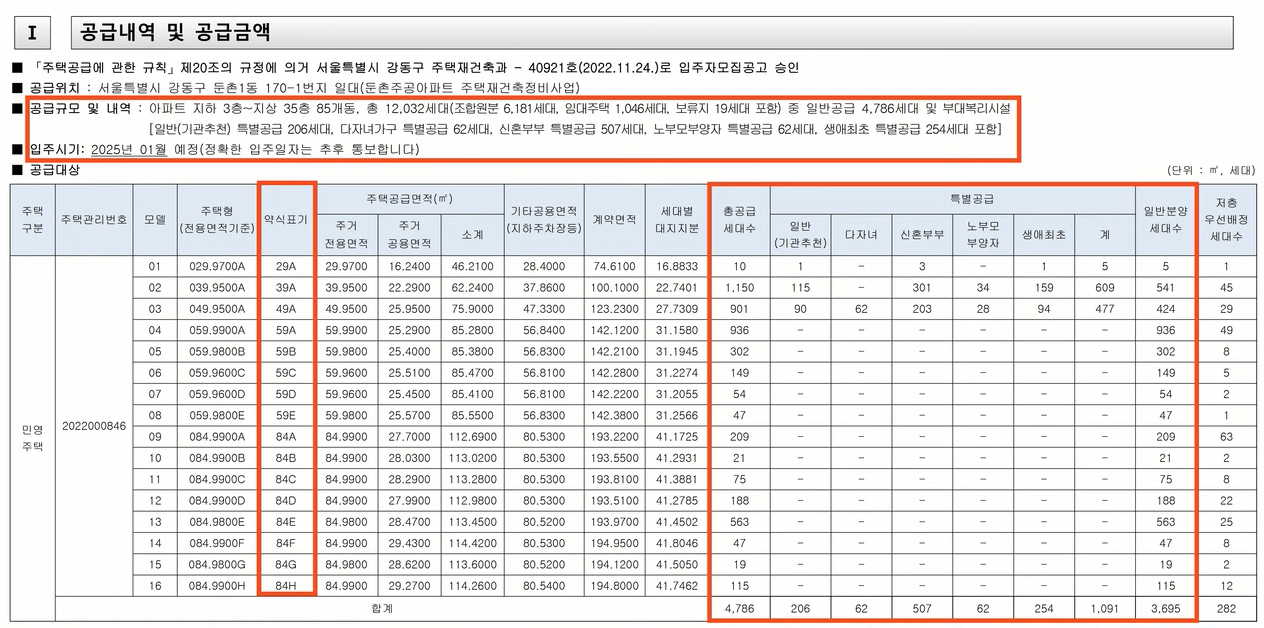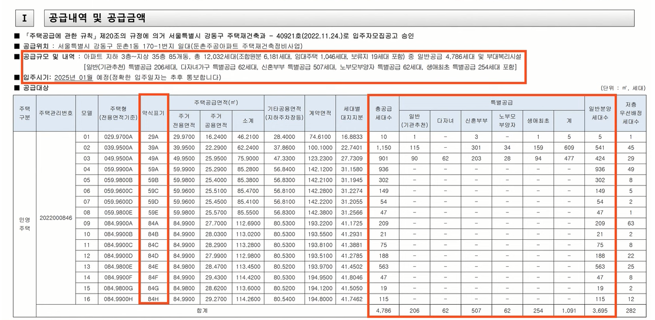 공급형태는 특별공급 일반공급으로 진행이 되겠고요 특별공급이 1091세대 그리고 일반공급은 3695세대로 구성이 되겠네요 확실히 분양가 때문에 특별공급이 많이 딸리는 걸 볼 수 있죠 특별공급 모든 평행이 2구 3구 4구제곱 소형으로 이루어질 수밖에 없었습니다.