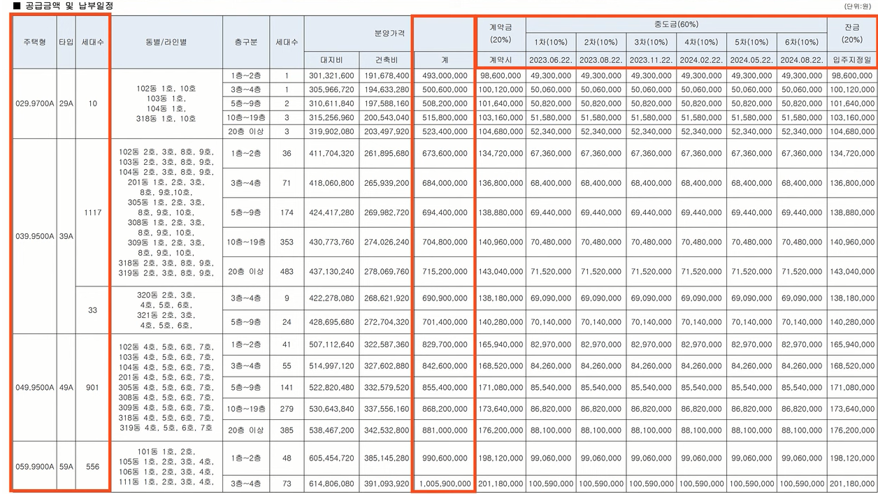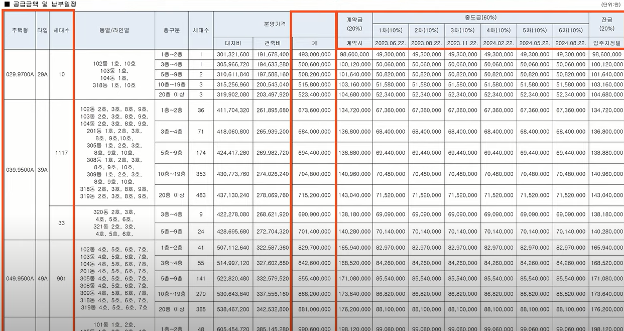 1차가 2022년 6월 22일 2차는 8월 3차가 11월 이런 식으로 마지막 6차가 2024년 8월 22일로 마감이 되죠 2 3개월 단위마다 분양가의 10%를 마련해야 하는 자금 부담이 있다는 걸 염두에 두시고요 그 분포가 굉장히 다양하죠 100만원대에서 1,800만 원 선까지 구성이 되어 있습니다.