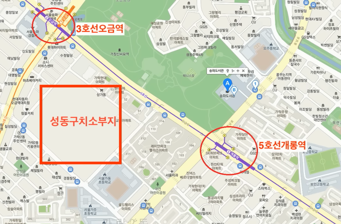 물론 여기 경쟁률은 600세대 정도 되는 한정판이기 때문에 거의 생존율을 위협할 만큼 치명적일 겁니다. 그렇다면 여기 교통 환경은 어떻게 될까요? 3호선 오금역이 도보로 3분 5호선 개롱역도 더불어 도보 5분 안팎으로 자리 잡고 있습니다. 트리플 역세라는 확실한 교통환경 구축해주고 있고요 주변 학부는 초중고등학교가 원스탑 학군으로 단지와 붙어있는 입지를 가지고 있네요..