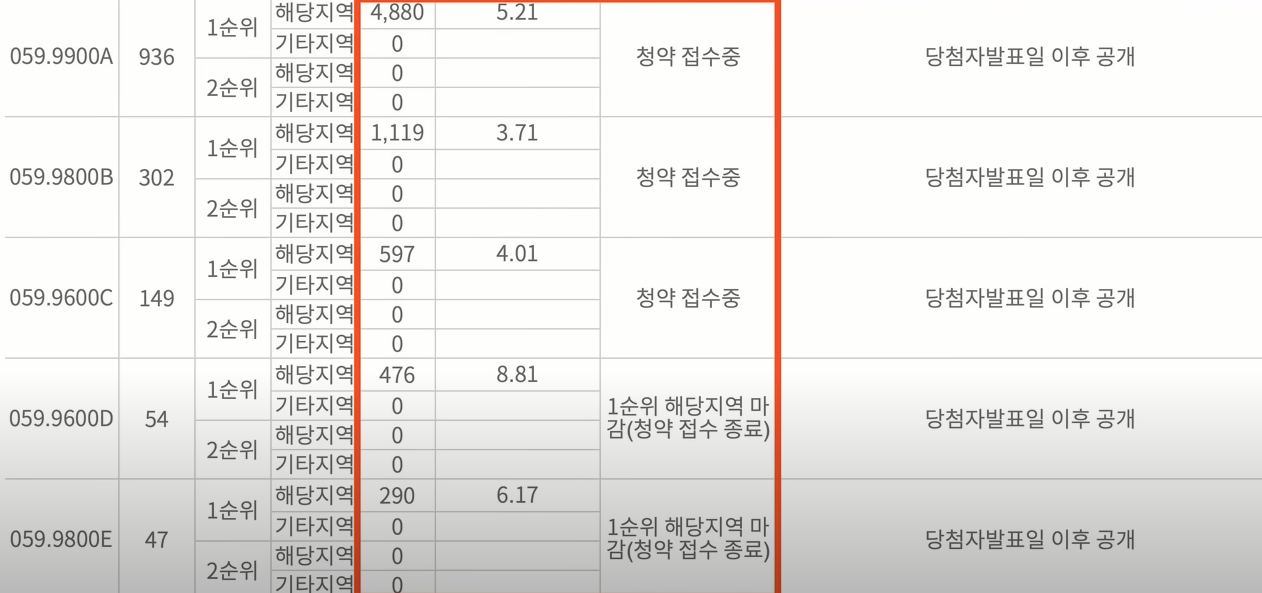 59abc가 600% 접수 인원을 충족 못해서 내일 기타 1순위로 넘어가게 되고요.. 논란이 됐던 59c 주방 뷰 당연히 600% 접수 인원을 채우지 못해서 4대 1의 경쟁률에 그쳤습니다. 그래도 4:1이라는 게 신기할 정도죠? 아마 상대적으로 수요가 적을 거라 판단하여 청약을 진행한 분들이 계신 것 같습니다.