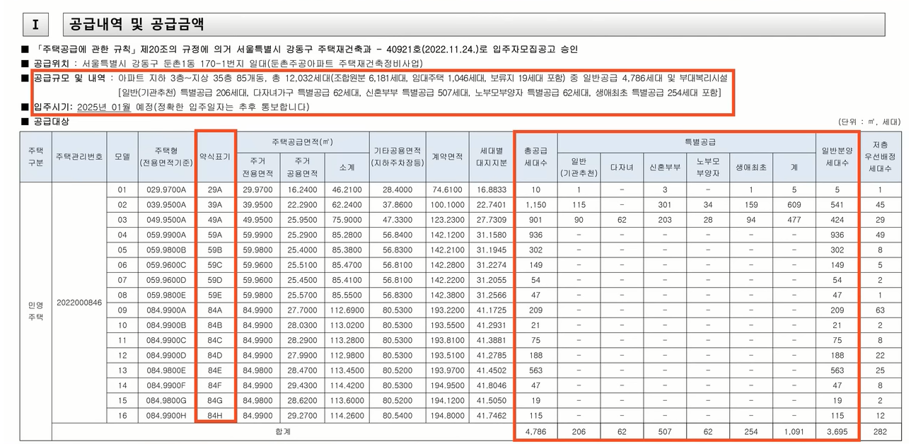 한편으론 소형평수가 8억 이하의 분양가였지만 실거주하기에 너무 협소하다는 것 그리고 향후 매도 시에도 핸디캡이 있을 수 있다는 점이 있고요 둔촌주공 단지 규모는 지하 3층에서 지난 35층 85개 동 12,032세대로 구성이 되어 있습니다. 왜 단군이래 최대의 재건축이라는 말이 붙었는지를 알 수 있는 대목이고요 전체 만 세대를 훌쩍 넘어가는 이건 매머드급 세계가 딱 붙어 있는 어마 무시한 규모를 가지고 있다 해도 과언이 아니겠습니다.