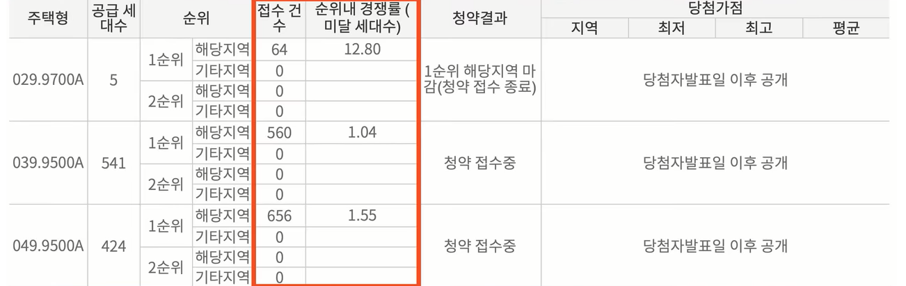 39a와 4\9 a는 600% 접수 인원을 충족하지 못해서 12월 7일 기타 1순위 접수를 받게 됩니다. 그리고 초유의 관심사였던 59 제곱 여기는 일단 중도금 대출이 가능한 곳이라 더욱 관심을 갖었습니다 그럼에도 불구하고 대부분 평형 타입에서 한 자릿수 경쟁률에 그치고 말았습니다.