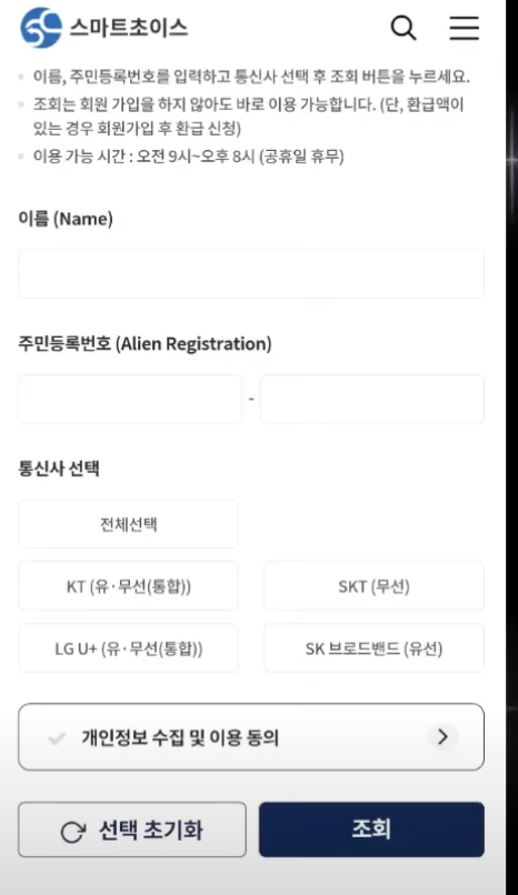 그리고 이름 주민번호 통신사 선택 및 개인정보 수집 동의를 체크하시고 조회를 누르시면 통신비 미환급금이 나옵니다.