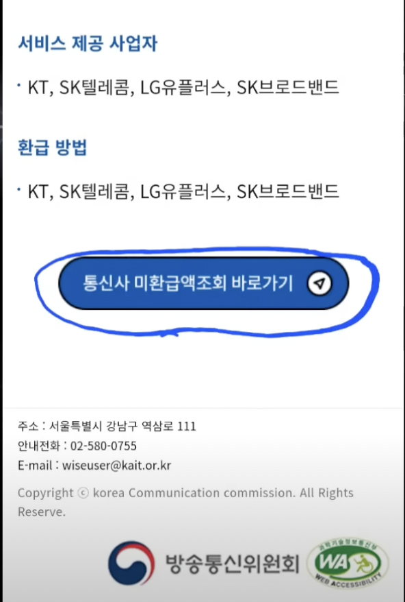 여기 통신사 미환급의 조회 바로가기 클릭 그럼 이런 화면이 나오는데요 참고로 여기는 방송통신위원회가 운영하는 곳이기 때문에 믿고 확인하셔도 됩니다.