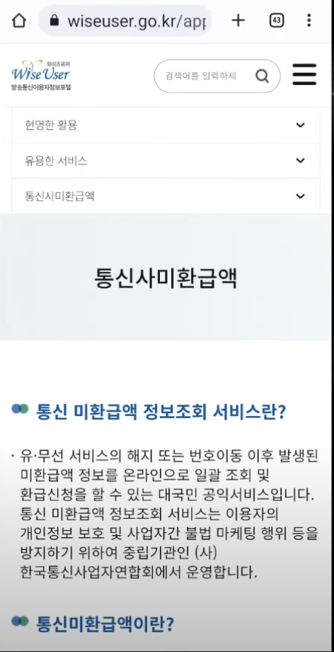 그리고 와이즈유저라고 검색하면 와이즈유저 밑에 여기 통신비 미환급금을 클릭합니다.