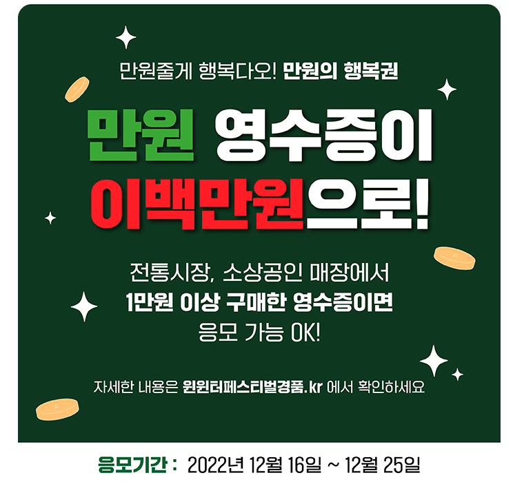 응모 방법으로는 1만원1만 원 이상 카드 현금 제로페이 직불 결제 모바일 온누리 상품권으로 결제한 12월 16일부터 12월 25일 동안 소비한 영수증만 응모 가능합니다. 신청 방법으로는 소상공인 제품을 1만 원 이상 구매한 고객은 윈윈터 페스티벌 홈페이지에서 만원의 행복권 이벤트에 영수증으로 응모하면 됩니다.