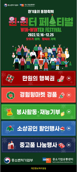 [한겨울의 동행축제, 윈윈터 페스티벌] 동행축제의 겨울버전 '한겨울의 동행축제, 윈·윈터 페스티벌'을 개최합니다. 중소기업과 소상공인을 위한 특별 할인판매부터 소외계층을 위한 나눔까지
