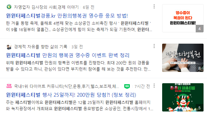 오늘은 12월 25일까지 전국민 누구나 참여 있지만 일만 쓰면 5만 원 50만 원 200만 원을 지급하는 윈윈터 페스티벌 만원의 행복권 이벤트에 대해 정보를 드렸습니다. 기본적으로 이런 이벤트는 소상공인과 소비자 모두 정말 윈윈할 수 있는 바람직한 이벤트인데요 한번 신청해 보시고 상품까지 당첨 되시기를 기원합니다. 오늘부터 꼭 신청해 보시기 바랍니다 좋은 일만 가득하시고 좋은 복 많이 받으시기 바랍니다