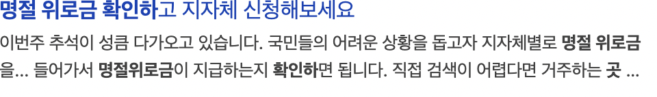 요즘 생활이 다들 어려우실거라 생각합니다 그래서 조금이나마 위안이 되고자 명절 특별 위로금이라는 제도를 설명드릴 텐데요 최소 5만 원에서 최대 50만 원까지 지원하는 명제를 위로금 현재 지급한 지역도 있고 지급하지 않는 지역도 있으니까요 영상 끝까지 보셔서 명절 위로금을 주는 지역 알려드리겠습니다.