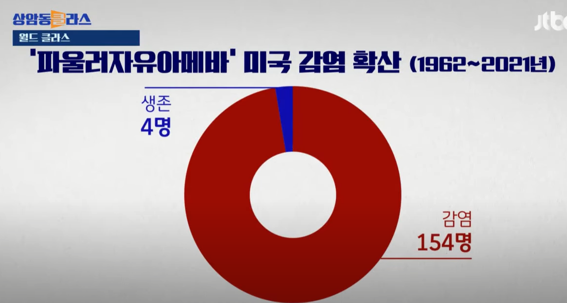 걸리면 이제 두통 12월 구토 등의 증상이 나타난 지 거의 5일 안에 대부분 사망한다고 합니다. 1962년부터 지난해까지 미국 내 감염 사례는 모두 154명이었는데요 그중에 딱 4명만 살아남았습니다. 치명률이 97%를 넘을 정도로 걸리면 거의 죽는 아주 무서운 전염병이라 매우 주의를 요합니다.
