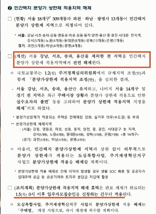 둔촌주공은 송파구 아닌가라는 착각을 불러일으킬 정도로 송파 생활권 안에 있는 강동구라서 이번 규제지역 해제 혜택을 보게 됩니다. 1월 5일 0시부터 효력이 발생하게 되고요 그리고 민간 택지 분양가 상한제 적용지역을 완전히 해제했습니다 물론 규제지역을 제외한 것이죠