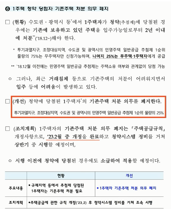 1 주택자들은 이제 비규제지역 그러니까 강남 서초 송파 용산을 제외하고 모든 청약지역에서 1순위 청약이 가능해졌습니다 그리고 기존 혹처럼 달고 다니던 기존 주택 처분 의무 폐지해 버렸죠.. 민영주택 일반공급 추천제 1순위 물량의 25% 정도를 가져갈 수 있게 됐습니다.