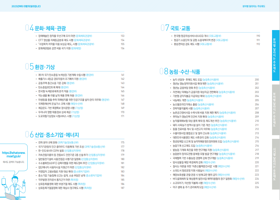 유난히 달라지는게 많은 2023년 아마 정권이 바뀐것도 큰 이유중의 하나라고 생각을 합니다. 이번에 정부에서 2023년도부터 달라지는 내용을 정리한 책자를 발간을 하였습니다 첨부화일에 참부하여 드릴테니 다운 받으셔서 읽어 보시고 2023년 달라지는 정책들 확인 하셔서 불이익 받지 않으시기를 바랍니다.