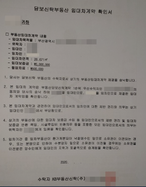 어느 날 찾아오신 분들이 신탁 계약 동의서를 받았냐고 물어보시기에 그게 뭐냐? 우리는 아무 이상이 없다고 해서 입주를 했다 하니.. 신탁회사로 부터 해당 물건에 대한 임대차계약을 진행하겠다는 사전 동의서를 발부받아야 정상적인 계약으로 간주되어 임대인의 사고가 발생하더라고 신탁회사 보다 우선순위 변제권을 갖게 된다는 말이었습니다.