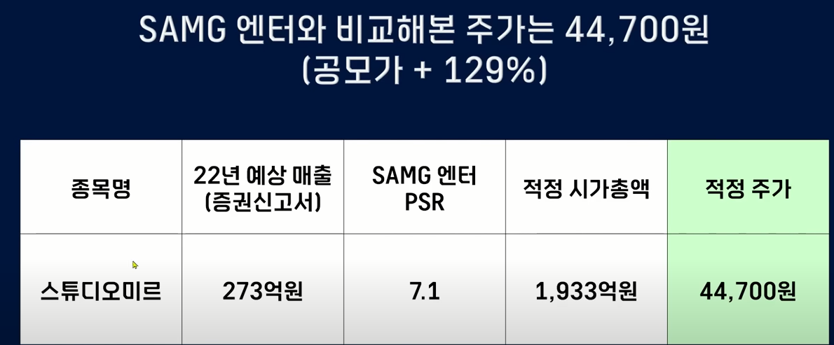 22년 영업수익 즉 매출액으로 273억 원을 추정을 했는데요이 추적 매출액으로 계산을 해보겠습니다 자 화면 보시면 눈이 부시죠 samg 엔터 밸류를 미래에 적용을 하니까 적정주가로 44,700원 계산이 됩니다. 공모가격대비 129%의 상승한 주가인데요 거의 따상 가격입니다.
