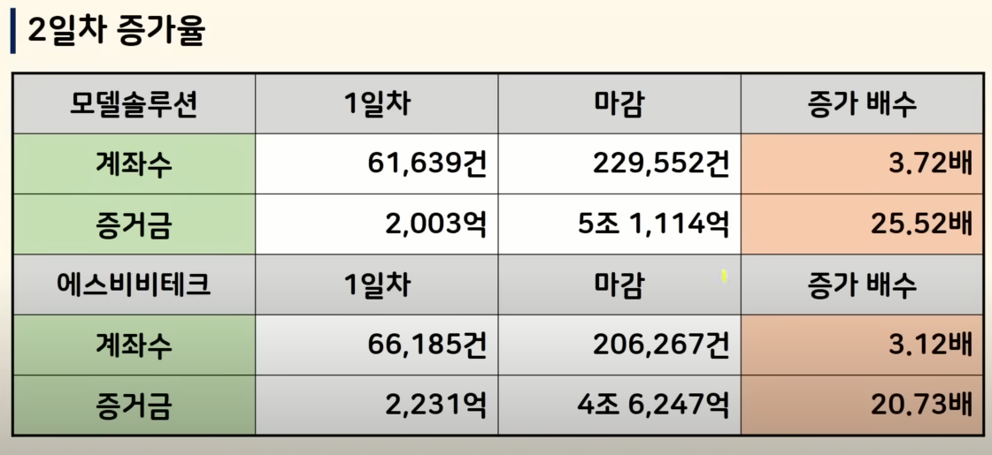 그래서 이들의 2일차 증가율을 계산했고요 모델솔루션은 2일 차 계좌가 3.72배 증거금은 5조 정도로 마감이 되면서 25.52배가 증가했습니다.