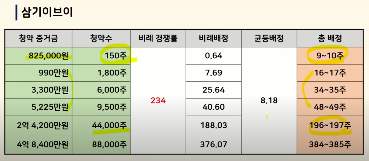 삼기이브이 예상 배정수 체크해 보겠습니다. 최소 1주는 150주 825,000원이 필요했구요 균등 포함하면 최대 10주까지 받게 됩니다. 그 외 1천만 원 3천만 원 5천만 원 정도 청약 시 예상 배정수가 되고요 온라인 최고 한도 44,000주 청약했다면 최고 197주까지 받게 됩니다.