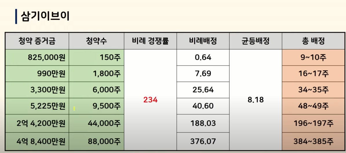 주관사는 미래에셋증권 단독으로 진행을 하고요 유통 금액 247억 비교적 적은 편에 속합니다 그리고 환불은 다음 주 넘어가서 1월 31일 화요일에 받을 수 있어요. 청약 결과 보겠습니다. 먼저 마감된 삼기이브이를 보면 계좌가 54,311건 증거금 5714억이 모였습니다 그래서 균등은 8.2주 비례 경쟁률 234대 1이 돼서 한 주 증거금은 129만 원이 필요했습니다.