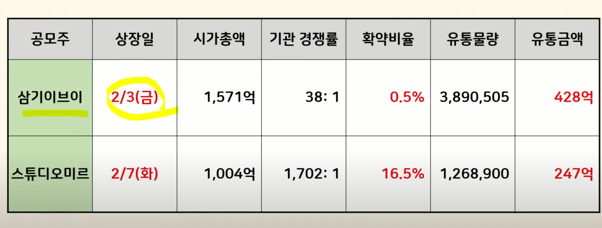 물론 예상치보다 참여가 많다면 이곳보다 수익은 더 떨어질 수 있다는 점 참고해주세요. 그리고 마감된 삼기이브이는 다음 달로 넘어가서 2월 3일에 상장합니다.