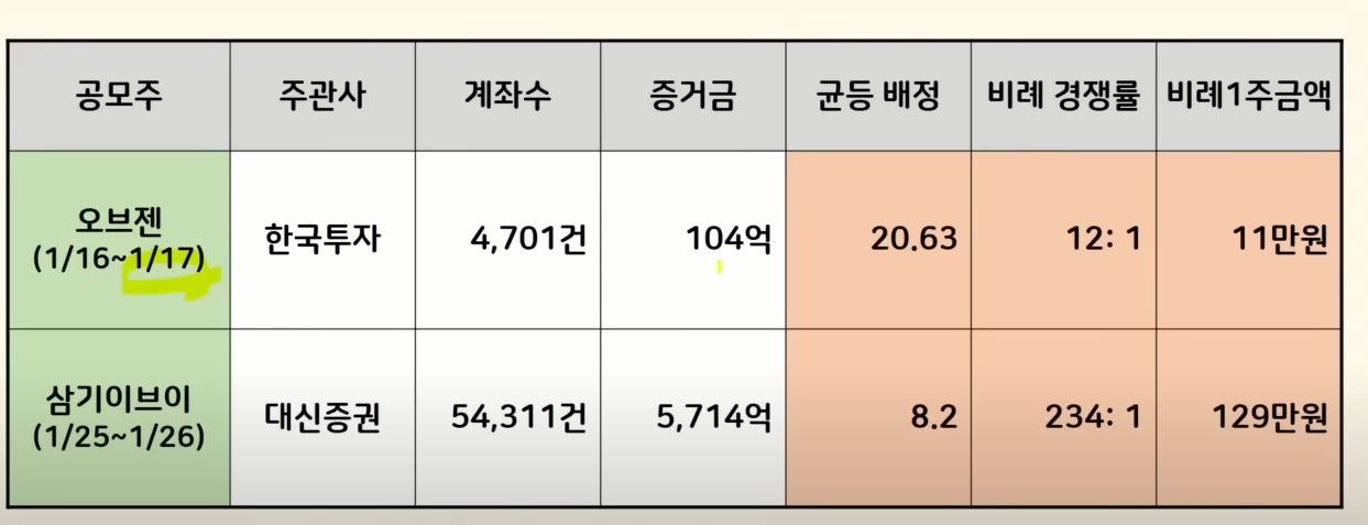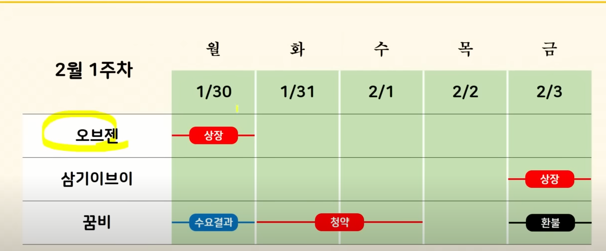 먼저 일정을 보면 상장이 두 종목 있습니다 오브젠 공모주는 이제 1월 30일에 상장을 합니다. 삼기이브이는 2월 3일 이번주 금요일에 상장을 하게 됩니다. 청약은 꿈비 공모주 하나가 있는데요 수요예측 결과가 월요일에 나오고 화요일부터 이틀간 청약한 다음에 바로 이틀 뒤 금요일에 환불을 받게 됩니다.