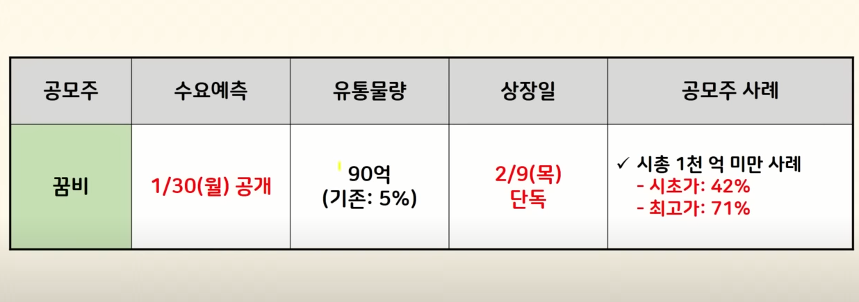 꿈비의 유통물량이 100억 도 안 되는 초소형이라서 업종 성장성 불문 기대가 될 수밖에 없습니다 작년 이후 시총 1000억 원 미만의 사례를 보면 시초가 42% 최고가 71%로 이게 평균이고요 모두 수익을 내줬습니다 수요예측 결과가 이제 내일 공개가 되는데 결과가 좋든 나쁘든 그래도 기대할 수 있는 공모주인 것 같습니다