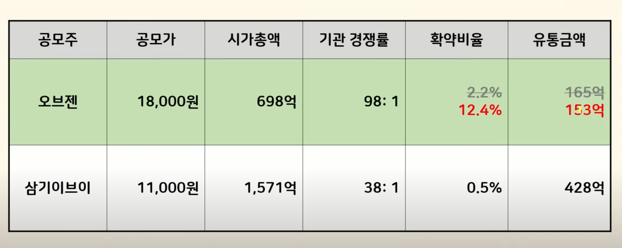 또 하나 미래 반도체 이야기를 해야 되는데요 상장일에 오랜만에 따상이 나왔습니다. 미래반도체 유통금액은 176억으로 규모가 작다는 게 큰 영향을 줬는데 오브젠의 유통 금액은 이보다 20억 이상 낮은 153억이기 때문에 비록 수요예측에는 차이가 있긴 하지만 오브제는 상장일도 기대가 될 수밖에 없는 상황입니다.