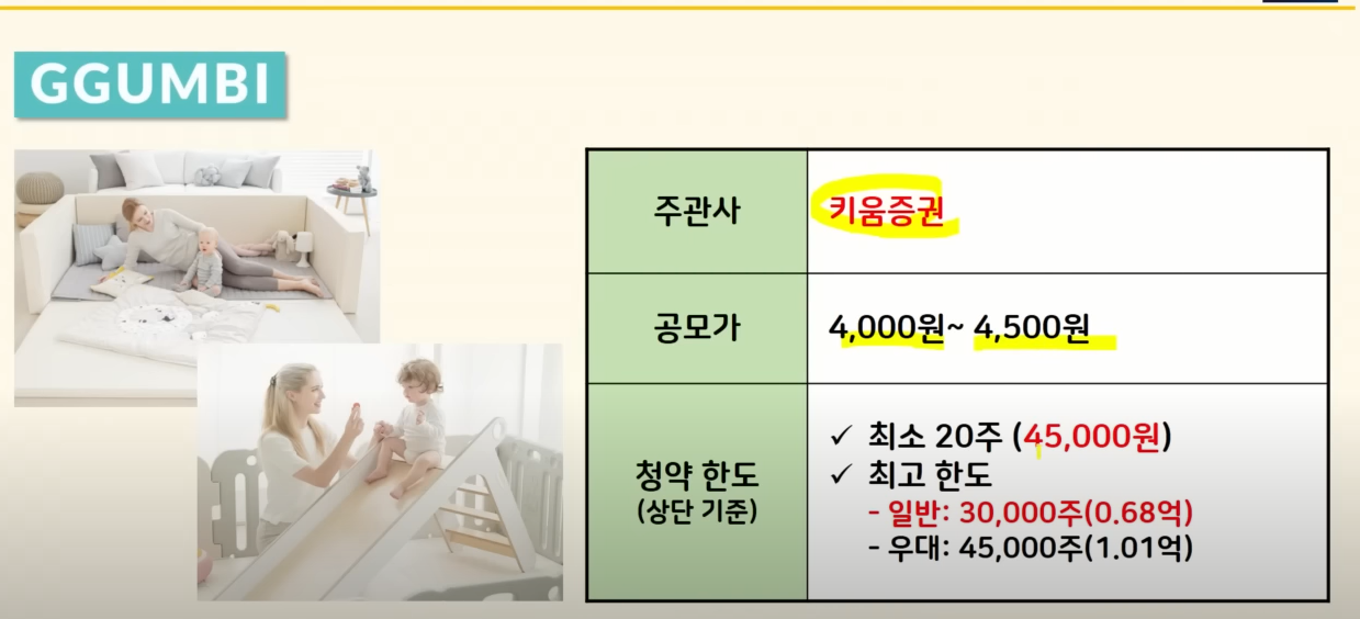 이 점은 유의가 필요할 것 같아요 자 그럼 이제 공모주 청약 바로 가겠습니다 꿈비 공모주는 유아용 매트 및 침대를 주력으로 하는 업체인데요 내수가 80% 수출이 20%가 있는  업체입니다.